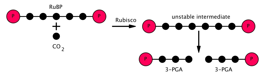 Sobald das CO₂ an RuBP gebunden ist, entsteht ein instabiles Zwischenprodukt, das sich schnell in zwei Moleküle 3-Phosphoglycerat (3-PG) aufspaltet. Dieses 3-Phosphoglycerat ist das erste stabile Produkt der CO₂-Fixierung und dient später als Grundlage für die Synthese von Glucose und anderen wichtigen Verbindungen.