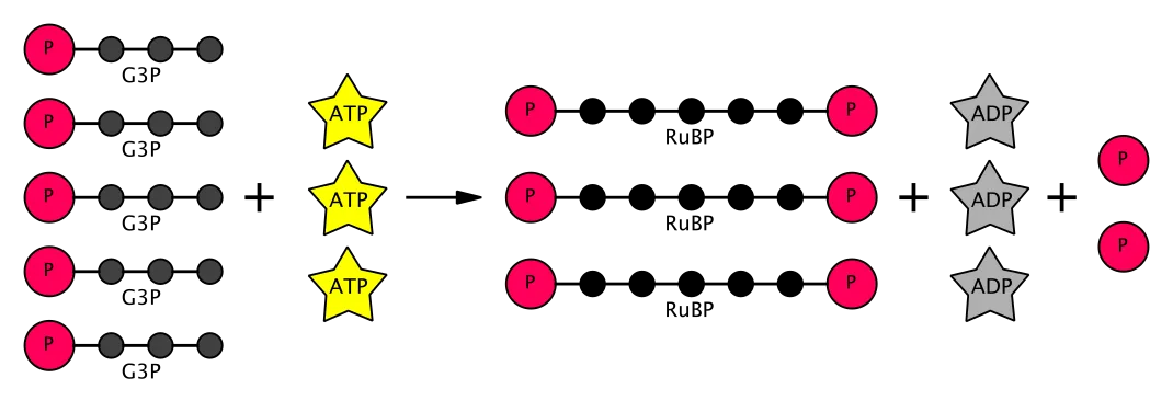 In der Regenerationsphase wird ein Teil des im vorherigen Schritt entstandenen G3P verwendet, um das Ausgangsmolekül Ribulose-1,5-bisphosphat (RuBP) wiederherzustellen. RuBP ist das Molekül, das zu Beginn des Calvin-Zyklus benötigt wird, um Kohlendioxid zu fixieren. Ohne die Regeneration dieses Moleküls könnte der Zyklus nicht fortgesetzt werden.